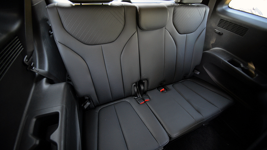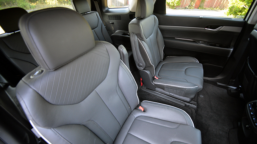 While other versions of the Palisade offer seating for 8, the XRT lacks the second-row bench seat requisite for maximum head count. Rather, Hyundai substitutes a pair of comfy captain's chairs for row two in the XRT. The tight third row remains available for a threesome, so in a pinch you can haul a total of 7 passengers. Better yet, if you plan on stuffing cargo into your Palisade, you'll discover an immense and inviting loading zone. With all seatbacks up and occupied, you'll still have access to 18 cubic feet of storage behind the third row. Fold Row 3 flat, and storage jumps to 45.8 cubic feet, with minimal side intrusion from the wheel well enclosures. If you need to go for broke and bury all the back-row seats, you're left with an immense load portal measuring 86.4 cubic feet. Needless to say, my mountain bike slipped through the liftgate with absolutely no fuss. Hyundai makes the loading procedure easier than you might expect by providing seat drop buttons in the aft compartment.
