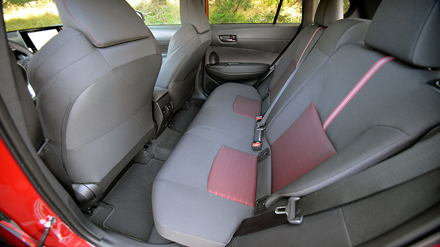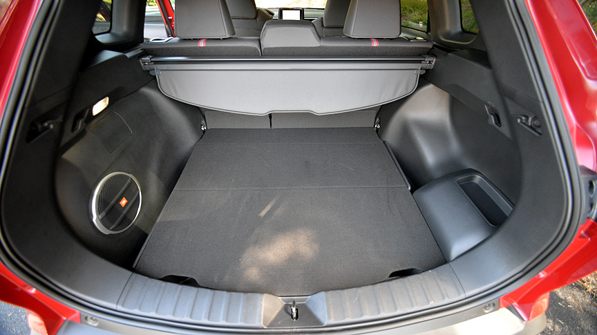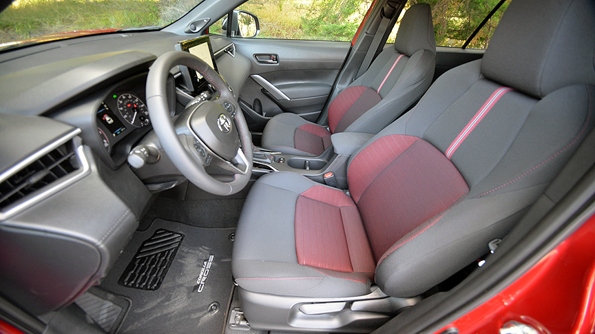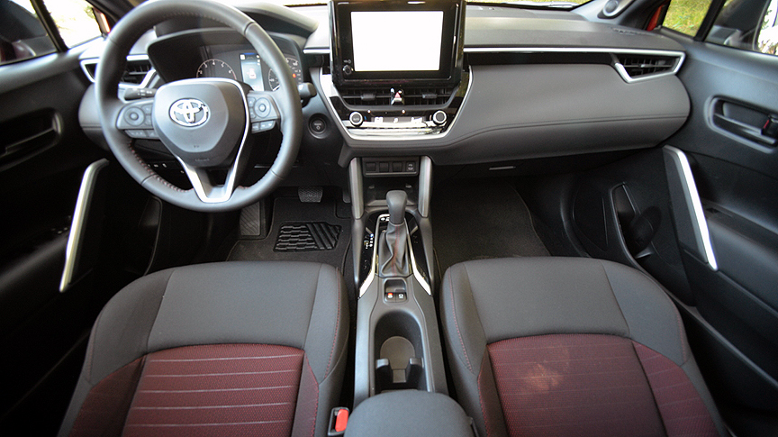 First off, it's handsome, in an understated way. The appearance of our test example was brightened up with a two-tone exterior color package ($500 extra) which combined Barcelona Red Metallic Paint on the lower panels with a piano black finish above the belt line. The contrast motif extends to the shiny black Nightshade finish of the following: external badges, roof rack and cross bars, heated outside rear view mirrors, housings for the LED headlights and LED stoplight housings. All these cosmetic tweaks distinguish the Nightshade model from all other versions of the Corolla Cross. The interior also receives special attention, with seating surfaces treated to black and red fabric with red stitching.