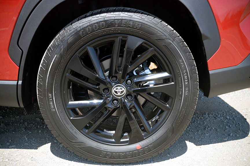 But even this dazzling visual presentation is outdone by the mechanical specification of the Corolla Cross HV's drivetrain. For starters, it's all-wheel drive, as discretely noted on both front fenders. All four wheels are equipped with piano black alloy rims shod with Goodyear Assurance all-season radials (225/50R18). These tires carry a lofty TW 540 treadwear rating that promises long intervals between tire replacements. The rims are bolted to Toyota's latest TNGA-C chassis platform, which is configured in Cross form to provide a healthy 8 inches of ground clearance. The double wishbone, multi-link rear suspension on this new chassis is particularly sophisticated, with sports-tuned shock absorbers providing a compliant and comfortable ride quality. A Drive Mode switch located at the front of the center console encourages you to select the ride comfort/performance setting that matches your mood, with my favorite being Sport.
