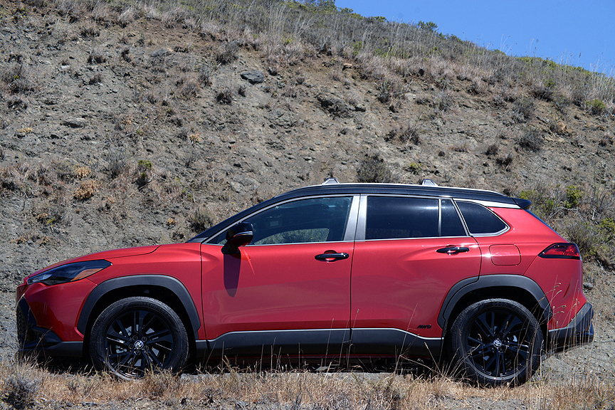 Luckily, the hybrid system is a lot better engineered than the spindly prop rod. Unlike the underpowered standard 169hp Corolla four-cylinder engine, the hybrid drivetrain in the Cross adds three electric motors to a 2-liter inline 4. This amalgamation produces 196hp. It may be hard to believe, but this hybrid arrangement not only bumps output by 27hp, but also improves fuel economy to 42MPG in overall driving. The engine propels all four Goodyears through a CVT transmission that effectively launches the Cross from 0-60mph in 8.0 seconds and posts a standing start quarter mile time of 15.6 seconds at 89mph. This engine loves to run hard, emitting an aggressive whine when prodded into full flight that is music to the ears. Out on the freeway, it seemed like every time we glanced at the speedo, we were unintentionally pushing 79mph without accounting for the Cross' laid back fast lane lope.
