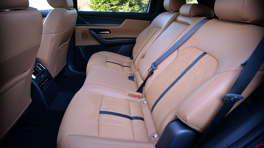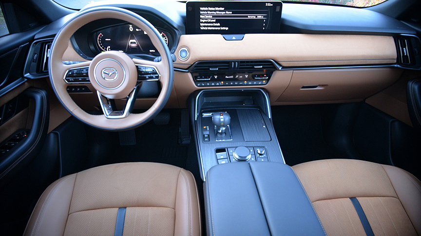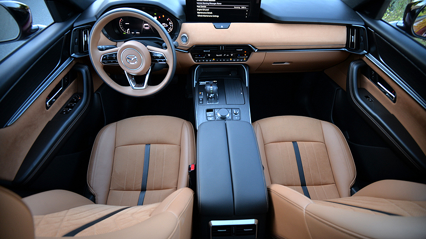 But the skimpy interior details of the Miata are thankfully absent in the plush cabin of the CX-70 Prestige Plus. Your first impression when climbing into the driver's seat will be overwhelmingly positive. The door panels and upper facade of the dashboard are covered with a faux suede material that feels plush to the touch and looks expensive. The insert cards in the upper section of the doors contain muted panels of a Formica-like material that complement the delicate triple row stitching of the armrests. The seating surfaces continue the penthouse vibe, with bands of subtle color variations enhancing the sense that you're catered to in that special way Mazda calls Kansei engineering.