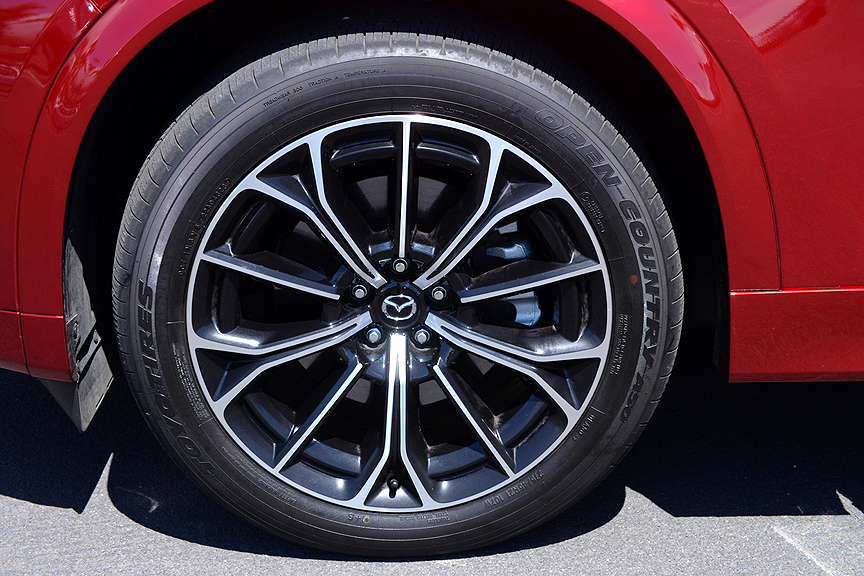The CX-70 is not just quick in a straight line, but surprisingly agile when the road throws you curveballs. The underpinning of good handling always starts at the contact patch, and Mazda doesn't stint in this regard. The Premium Plus model bolts a set of larger than life 21-inch alloy rims and radials to each corner. These behemoth rollers (Toyo Open Country A50) measure 275/45R21. We quickly discovered that for an all-season tire, their dry weather grip (TW 300) proved reassuring. Contributing an assist to the handling prowess was the typical vernier steering precision Mazda manages to generate in all their products. This giant SUV duplicates the exactitude in placement you experience in a much smaller Mazda SUV like CX-5 or CX-50. In fact, the kind of reassuring feedback offered by the CX-70 is very much a direct descendant of the exactitude you experience in an MX-5 Miata.