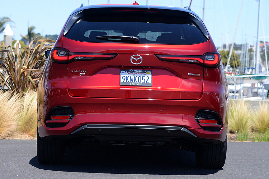 With one major exception, the 2025, 5 passenger CX-70 is virtually identical to the 7 passenger CX-90, which Mazda introduced as a 2024 model. The difference lies in seating arrangement. The CX-90 provides three rows of passenger accommodations, while the CX-70 eliminates the tightly packaged third row in favor of a more spacious second row. It's simplified design also makes it easier to convert the interior of the CX-70 to a cargo hauling layout. Mazda provides a pair of electric control buttons located inside the aft C-pillar that allow you to remotely collapse both second row seatbacks (split 60/40) from the rear loading area. That nifty design allowed me to swing my mountain bike through the yawning tailgate and load it into the cargo bay with a welcome ease I have experienced in very few other SUVs.