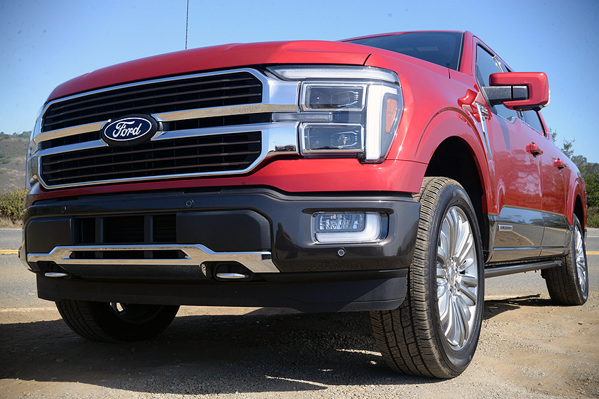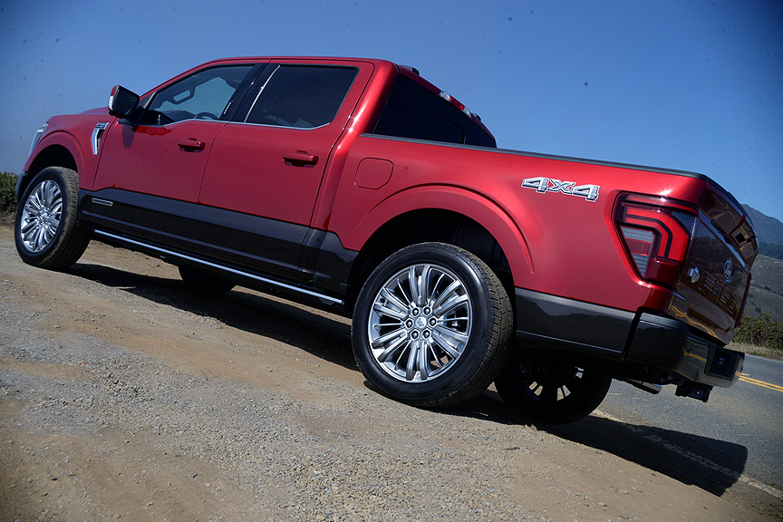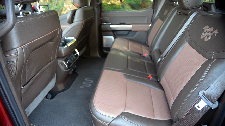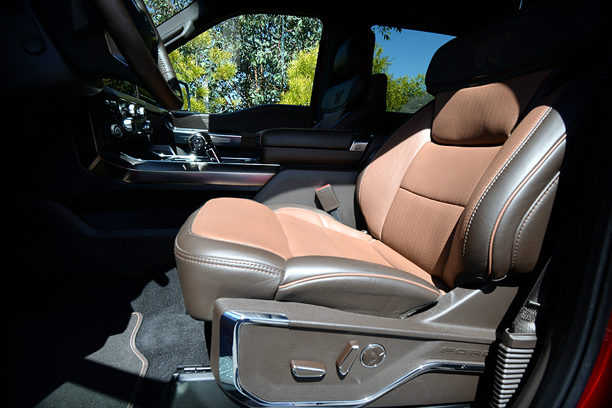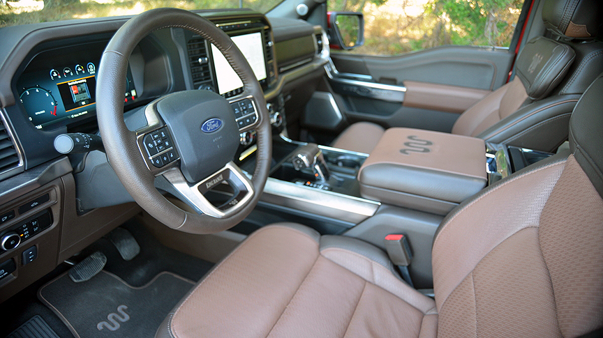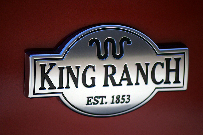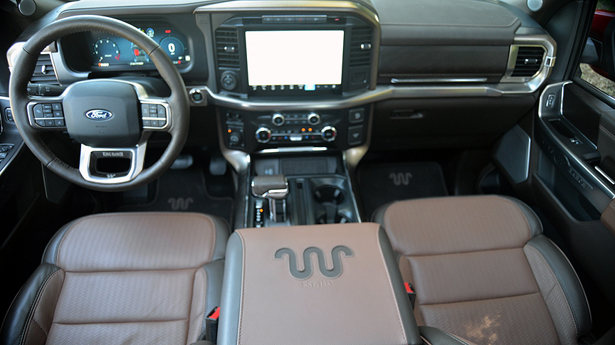Currently, the last bastion of intelligent cockpit design can be found in styling studios specializing in truck interiors. Since most of these vehicles are primarily geared to appeal to drivers who actually work from their truck cabs, the silly control panel frippery that has degraded passenger cars and SUVs is blessedly absent from most truck cabs. In particular, the F series panel layout resembles the cockpit of an aircraft, with every switch and knob clearly labeled with fixed ID tabs. We particularly loved the fan control, which provides a protruding chrome flip switch. This simple piece of engineering works so much better than the annoying digital sliders that have become standard fare today. Ford's paddle fan switch makes life simple: push up for more fan, down for less. The meaty seat-side controls for the King Ranch's plush Barcalounger style chairs are also straightforward and large enough to be manipulated by gloved hands. The "bucket" front seats themselves are 10-way power adjustable, finished in a serenely soft cocoa leather, and fitted with massaging functions, ventilation and heating. The rear buckets also enjoy heating enhancement, and can be folded flat for lockable storage use. A full dozen King Ranch "w" logos abound throughout the interior. Particularly notable is the repetitive "w" filigree across the dash and atop the door cards. No fewer than seven exterior ”KR" emblems distinguish Ford's top line model from lesser F-Series pickups. When you're behind the heated, leather-wrapped steering wheel of a King Ranch truck, Ford doesn't let you forget your good fortune.
