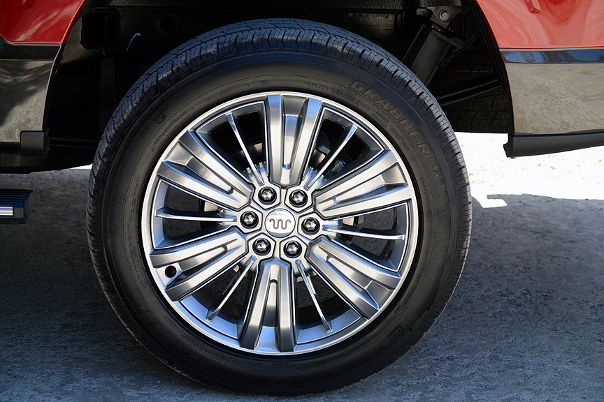 Considering its girth, the 4x4 Supercrew felt surprisingly agile when handling secondary roads with bad pavement. It's fitted with dazzling 22 inch "Premium Painted Rims with Chrome Inserts" mounting 275/50R22 General Grabber "extra load rated mud and snow" radials with a rock hard rubber rating of TW 660. These monster truck tires jack the hybrid's cabin far enough off the pavement to necessitate using power retractable running boards to facilitate cabin entry. As you near the locked King Ranch cab, the boards automatically extend, the cabin interior illuminates, the doors unlock themselves, and the driver's seat slides back to ease entry. Once seated, you press the fat starter button which actuates yet another series of programmed events like the forward slide of the driver's seat to a predetermined position.