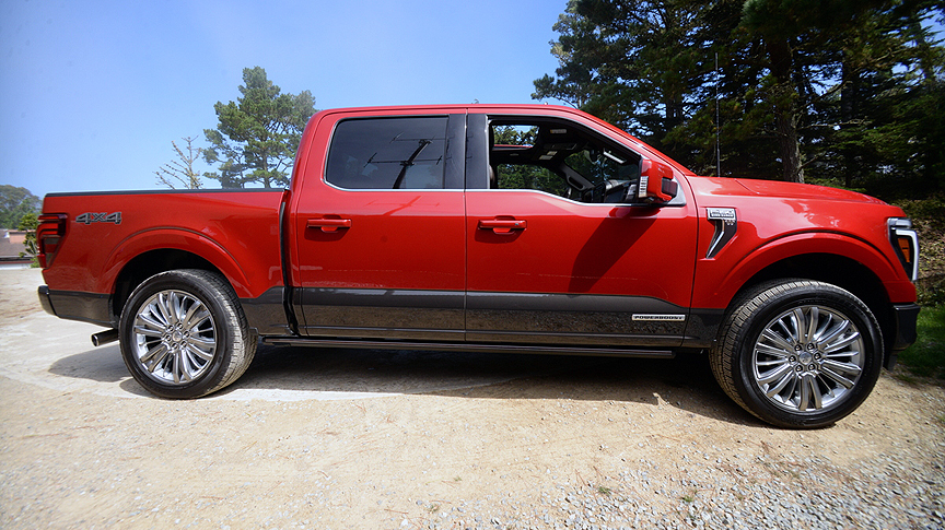 Grasp the enormous chromed shift lever to engage Drive (no push buttons here), and this cosmetically and mechanically special F-150 states its case as that the PowerBoost Hybrid King Ranch is very much King of the Road.