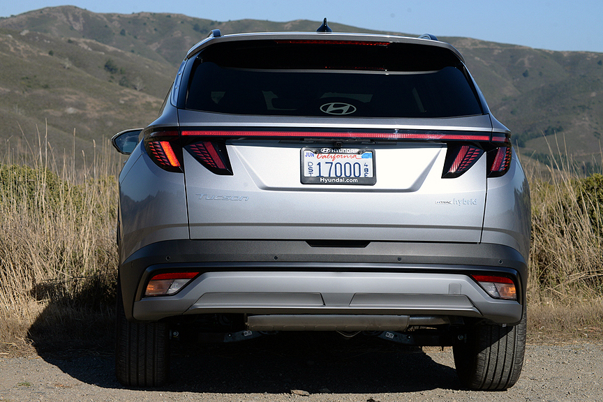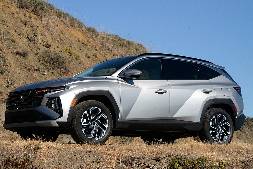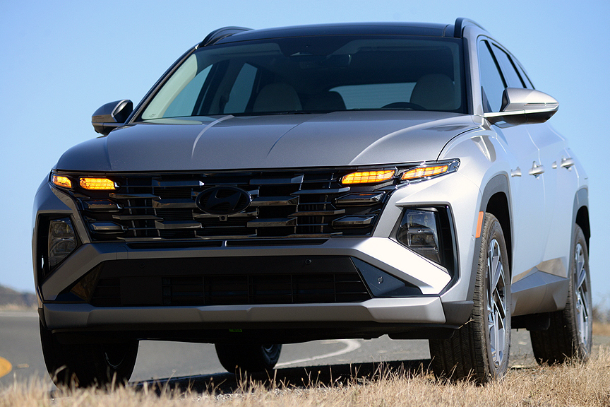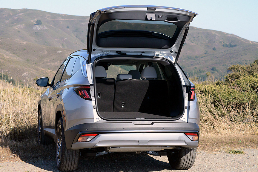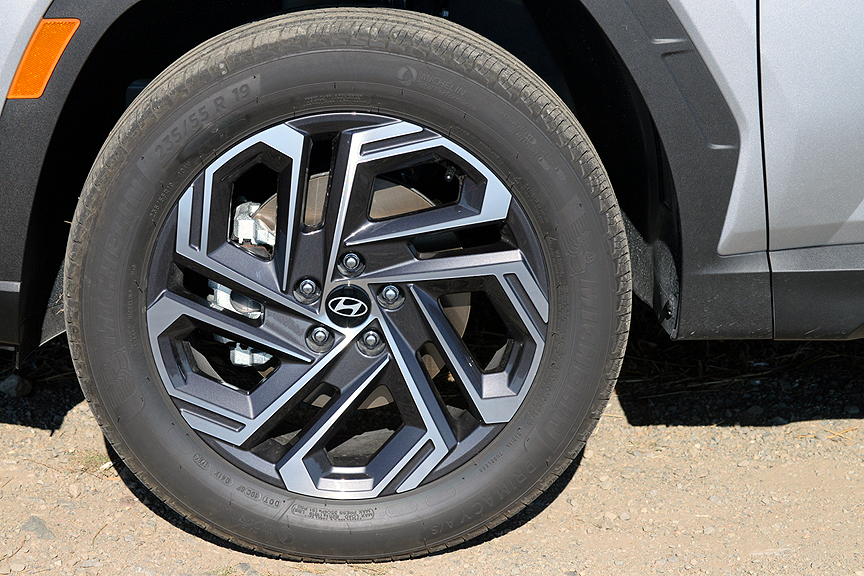 Our test Tucson was finished in a rather understated shade called Shimmering Silver, a color that integrated particularly well with the SUV's simplified-for-2025 front grill. The complicated design of the Limited's sparkling silver and notchy black 19 inch alloy rims works particularly well with the dagger-like patterning of the Tucson's multi-faceted flanks. Mounted at each corner of this all-wheel-drive platform are 235/55R19 Michelin Primacy A/S (all season) radials (TW 540) that proved surprisingly competent. They helped the Tucson maintain a high level of grip from track-in point to apex to exit on a scintillating dawn blast up Coast Route 1. The fact that the Michelins are 55 series rather than 50 series radials helped maintain the Tucson's comfortable ride quality. We had dialed the Drive Mode setting to Sport before we started, and instantly discovered that Hyundai has calibrated the steering effort perfectly for feel and feedback when you're attacking apexes. While the Tucson may not look like a candidate for the Sporting SUV Hall of Fame, I discovered its true potential that foggy morning out on Route 1.