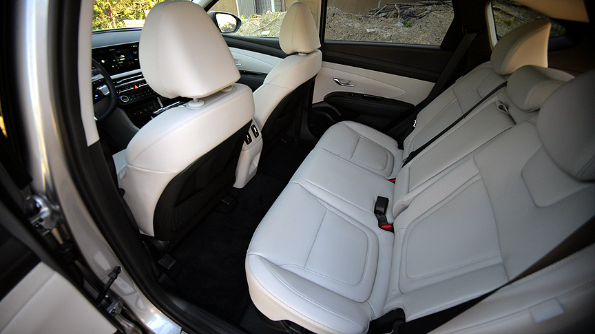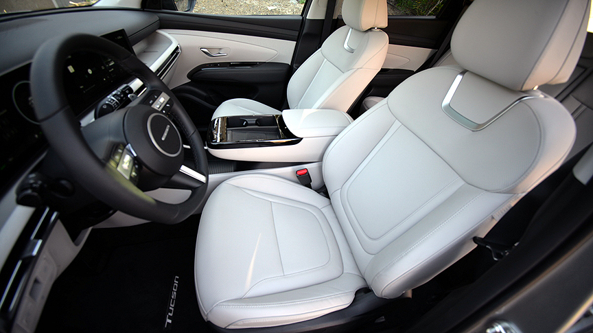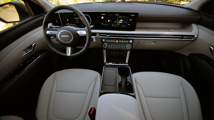Hyundai has lavished a plethora of creature comforts on the Limited Tucson. Both front seats and both rear seats boast 3-stage heating, as does the steering wheel. All these functions, as well as all HVAC operations, are thankfully delineated on clearly labeled physical buttons splayed logically across the lower face of the dash. The dashboard's upper face is occupied by a sweeping pair of 12.3-inch information screens, with the driver's screen dedicated to engine and road speed readouts, and the adjoining central display dedicated to infotainment selections and mapping needs. Both Apple CarPlay and Android Auto are finally integrated into this well designed visual arcade.