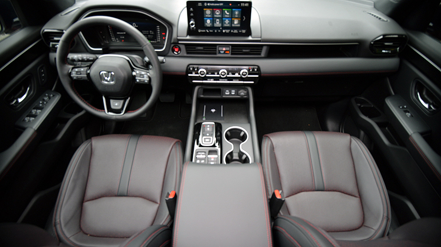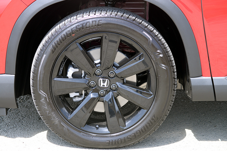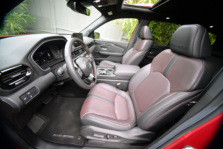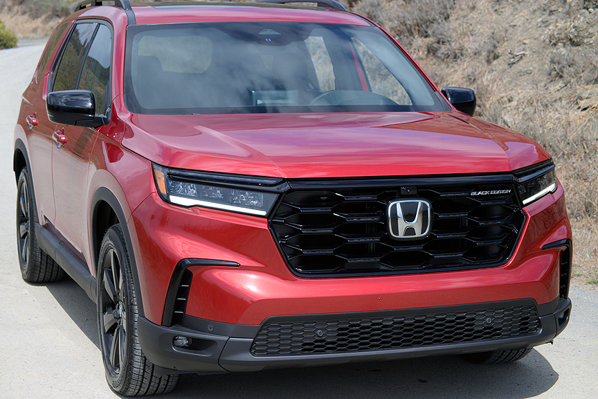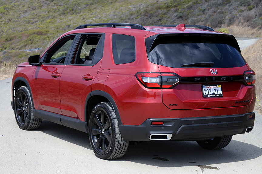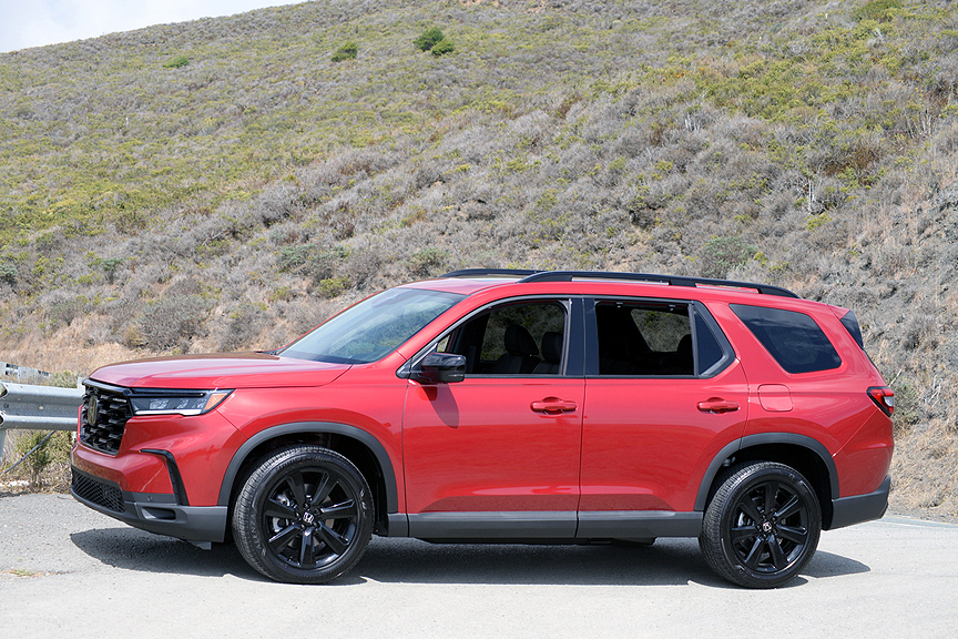 Handling proved crisp rather than cumbersome. Honda equips the Black one with relatively tall sidewall Bridgestone Alenza Sport A/S M&S radials measuring 255/50R20 (TW500). Unless you need the extra ground clearance of the Trailsport Pilot, the Black Edition is better suited to paved road usage. Considering its substantial 4,709lb. curb weight, our Radiant Red Rocket proved itself well suited to coping with the many twists and turns of California State Route One.