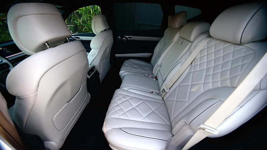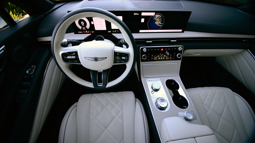 Somewhat less successful is the control layout atop the center console. In a move that favors symmetry above practicality, Genesis has positioned two identically sized control knobs, one in front of the other. The forward dial controls inputs to the OLED screen, while the crystal-rimmed rear knob controls the shift-by-wire automatic transmission. I am not a fan of rotary knobbed shifters because they require way too much concentration plus visual certification to operate. Providing an adjacent control similar in size but not function creates a recipe for confusion.