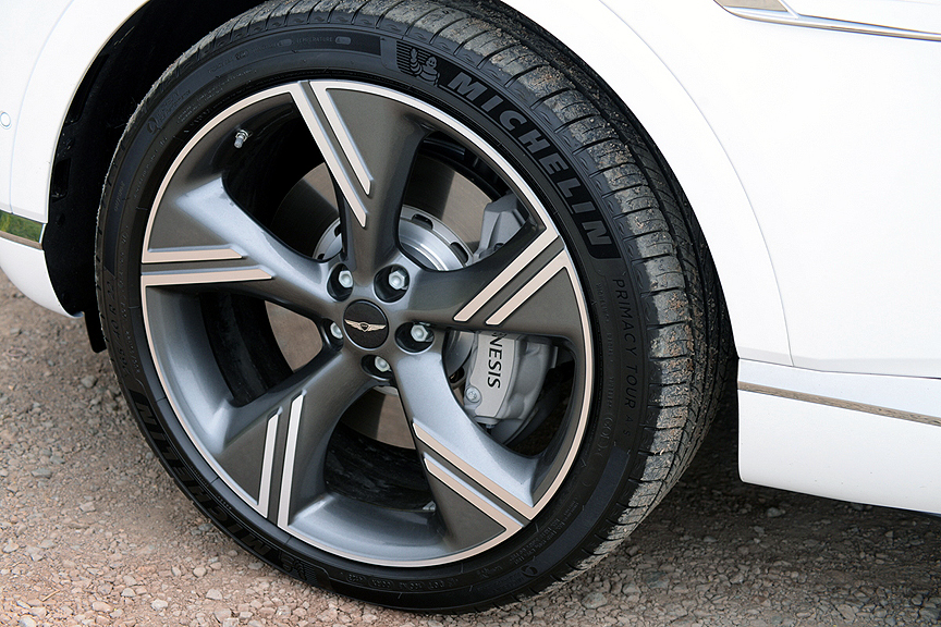 Opt for the top echelon Prestige GV80, and your ample wheelwells will be graced with a set of 8.5Jx22 inch alloy rims mounting 265/40R22 Michelin Primacy Tour all-season radials with a long life TW 580 rating. The metallic gray 5-spoke alloys are visually arresting, with a pair of machined hash marks enlivening each spoke, and light gray brake calipers peeking out from behind the rims. The Michelin rubber proved grippy enough, but the 40 series tires provided a rather harsh ride over bumps and roadside imperfections. You can modulate suspension and steering feedback with yet another (smaller) center console-mounted rotary wheel with detents for Eco/ Comfort/Sport/Snow preferences. Handling of this 5,100 pound SUV proved surprisingly spry, with accurate steering feedback, very little cornering lean, and plenty of forward thrust from the "3.5T" 375hp twin turbo V6 that powers all four Michelins through an 8-speed automatic gearbox. If you take this Genesis to the Wednesday Nite Drags, you'll surprise the Ford and Chevy crowd by posting a quarter mile run under 14 seconds, with 0-60 flashing past in 5.4 seconds. Top speed runs out at 145mph.