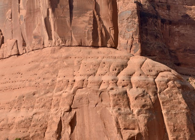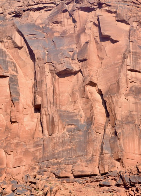 At the edge of Moab, Highway 128 winds through more canyons and along the Colorado River for more than thirty miles of sheer-cliff formations that broaden out to narrow valleys along the river, then weave back into narrow passes. Vertical rock surfaces are sculpted, tinted and carved by the hand of The Artist into an endless variety of art pieces.
