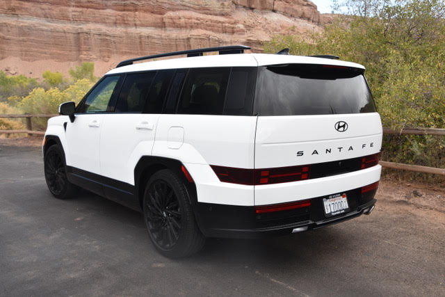 This 2024 version of the Santa Fe represents the early stages of a new design language for Hyundai characterized by squares, rectangles and simple lines. The black and white paint scheme provides a crisp, modern ambiance. Big, black wheels and just a hint of red where the taillights wrap-around, contribute to its simplicity. Surprisingly, the taillight bar is low on the rear fascia flying in the face of conventional wisdom that would have rear lights higher for better visibility. Most of the chassis and powertrain is carried over, but the look is strikingly different.