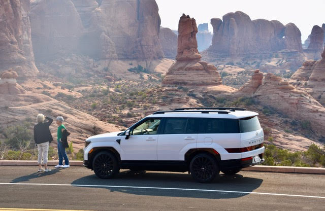 The six-hour drive from Denver to Moab along Interstate 70 allowed time to acclimate to the Santa Fe. The interior looks and feels upscale with luxurious materials including: a faux suede headliner; broad multipurpose screens (one for IP and the other for infotainment); soft touch plastics; leather seats; a center stack angling from the dash to a broad console where dual wireless chargers, power outlets and deep cup holders reside. A shelf across the right side of the dash, a bin beneath the center stack, and other thoughtful cubbies contribute to thoughtful storage options.