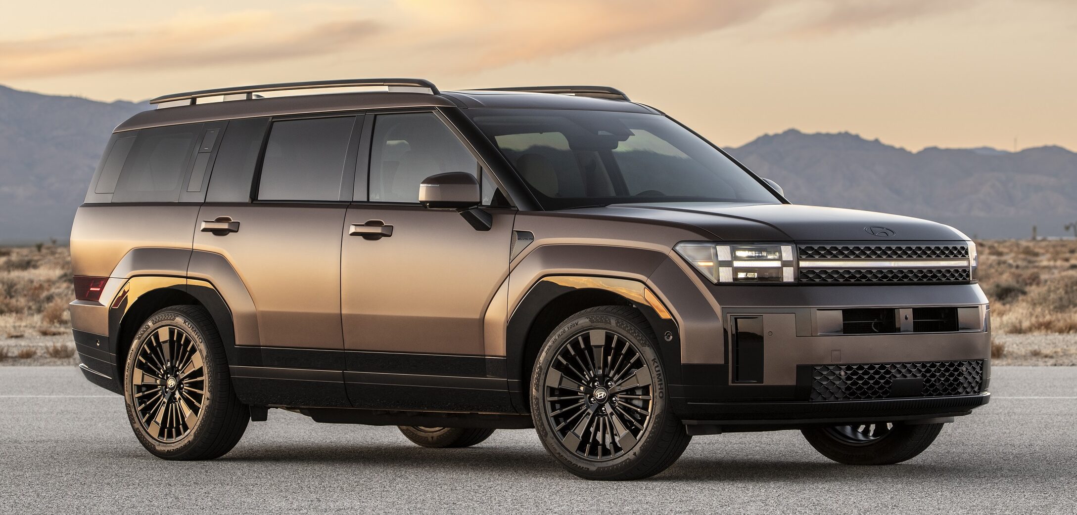 Santa Fe Calligraphy models are attractively dressed in 20- or 21-inch tires. Gas models roll with 21-inch 245/45 tires. Hyundai says hybrids are on 20-inch 255/45 tires for efficiency.