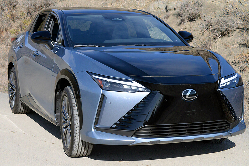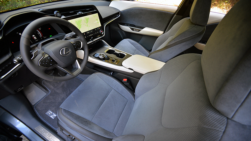 Now there's no mistaking the infusion of goodness when you slip into the thoughtfully appointed cabin of the RZ 300e. After all, the descriptive word in this model's name is Luxury. Accordingly, the dark grey Ultrasuede-trimmed front seats are heated, ventilated and fitted with full power adjustments to free you from the usual chaos of daily life. Front and center of this welcoming place, the hearth if you will, is a 14.3-inch touchscreen that controls infotainment and cloud navigation functions. HVAC duties are thankfully assigned to a pair of extra large temperature dials plus a number of physical buttons. Lexus provides "Up To 10 years" of Safety Connect and Service Connect service, plus a 3-year renewable Remote Connect Trial. Once you sort through all the expirations and limitations, you'll find yourself subscribing to a network of internet-based aids you initially thought came free for the price and life of your car.
