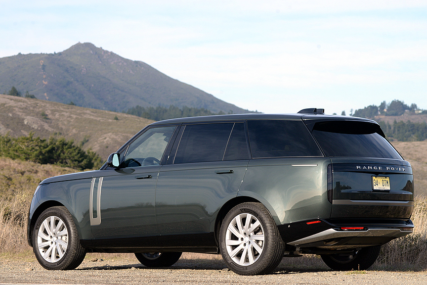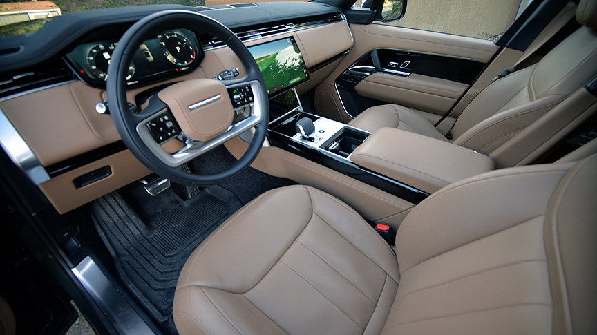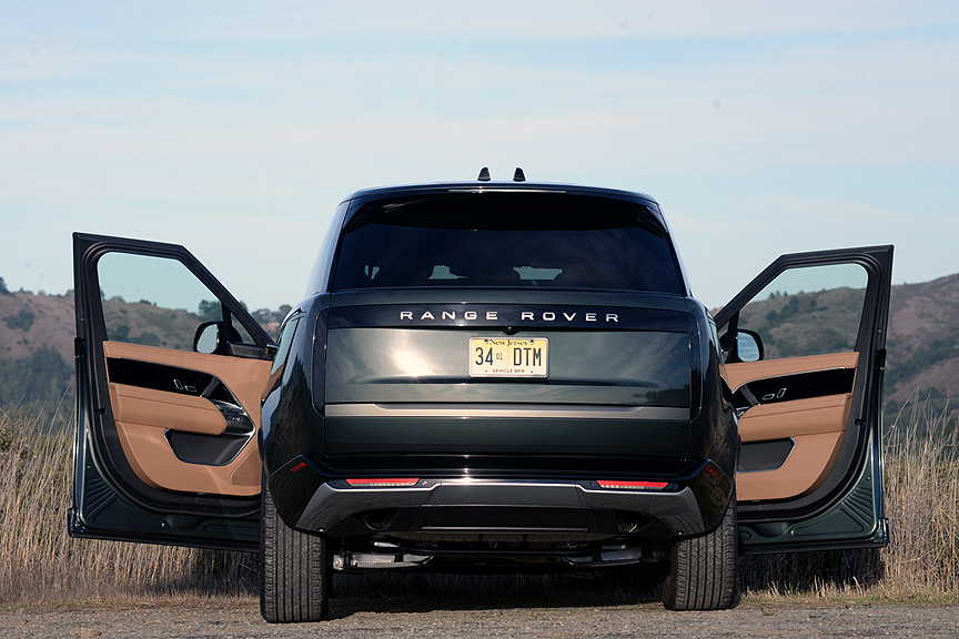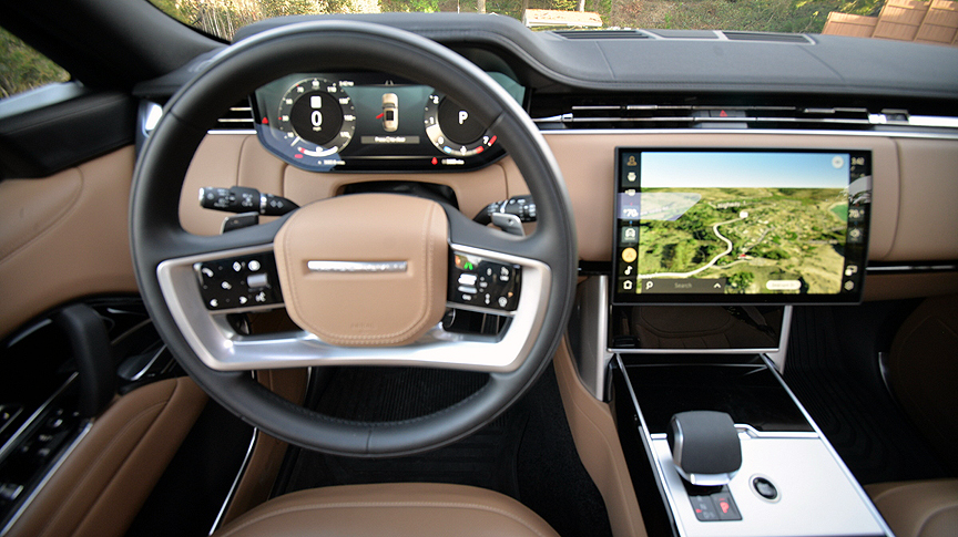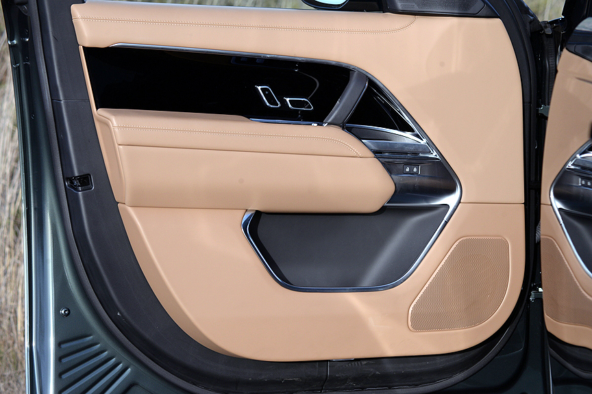 The operation of the exterior door handles characterizes how carefully Rover tailors the finished look of the exterior. Once you've programmed the remote key fob for "walk away" operation, the four "deployable" door handles automatically pop out from their flush nests to give you and you passengers sizable handholds. Otherwise, they stay buried and invisible. Once you've slid into the "Caraway" colored cabin, you'll luxuriate in the stupendous support provided by the dual front thrones, each fitted with massive adjustment pads fitted to the door panels. Both seats are covered with "extended Windsor leather," fitted with heating and ventilation, as well as memory settings. The center tunnel contains a storage bin so deep that small objects will disappear from sight like pebbles in a well. The center console contains just a single button for engine stop/start, a short and stubby shift lever, plus a wireless device charging pad that can be covered when not in use. The layout here is slick, ultra-modern, and stunningly beautiful. All visible surfaces are covered in finest grade leather which also graces the large center pad on the steering wheel. Surrounding trim on the wheel and center console surfaces is uniformly tailored in Caraway hide. You might think this is as plush as an SUV can get, but Rover offers enough variants of the Range Rover to cover a price range that tops out at $234,000. So consider our test vehicle to be the entry-level model.