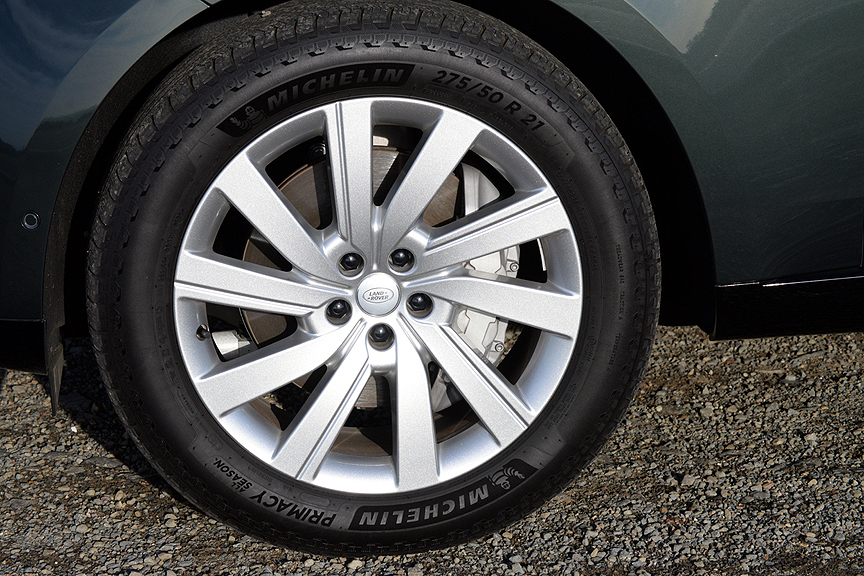 Rover fits the Rangie, as it is lovingly called by its enthusiast owners, with self-leveling air suspension, which kneels down to ease entry, then rebounds to ride height appropriate for whatever terrain you need to traverse. They call this feature the Electronic Air Suspension and Adaptive Dynamics," and link its behavior to a "Terrain Response 2 System" that offers selectable driving and off-road modes. Blessedly unfussy 21 inch alloy rims support 275/50R21 Michelin Primacy A/S tires with a stout TW 540 rating. With full-time four-wheel drive running through a twin-speed transfer box, the Range Rover is a consummate off-road tool, well equipped to maneuver through almost any catastrophe you can throw at it.