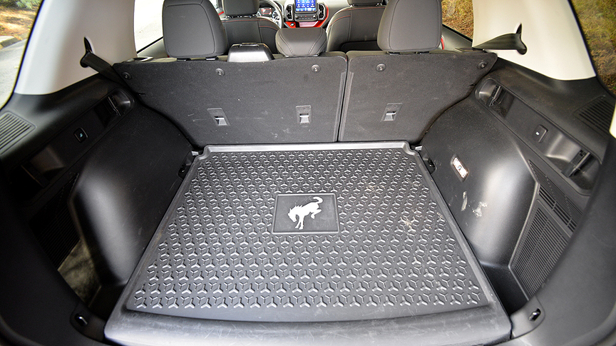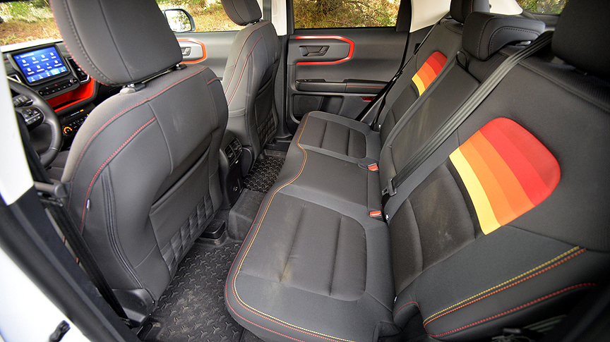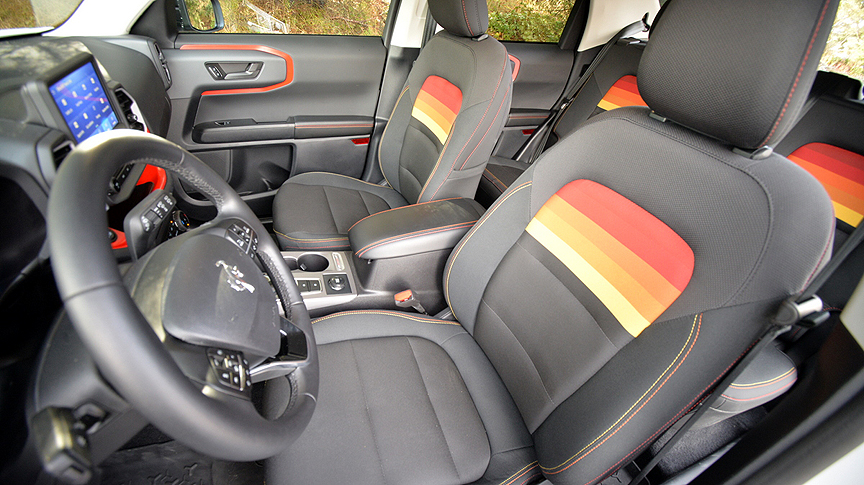 For most of our driving, the 1.5-liter motor proved adequate. Only when passing slower traffic or accelerating to match freeway speed did we note its marked lack of grunt and rather noisy sound track. If it were up to us, we would forego the stellar paint and tape of the Free Wheel decoration package in favor of the stouter motor available in the Badlands Bronco Sport. But we did like the the looks of the rainbow-striped seats made from “Sunset Weave Cloth.” Ford calls the embellishment “Ebony Ombre Stitching” and it definitely added a whimsical element to the freewheeling concept. Unfortunately, the slab-backed seats were not nearly as comfortable as they were pretty. In keeping with the outlaw theme, each time you fire up this Bronco, the video screen on the dash projects a cartoon rendition of desert boulders morphing into a prancing wild horse.