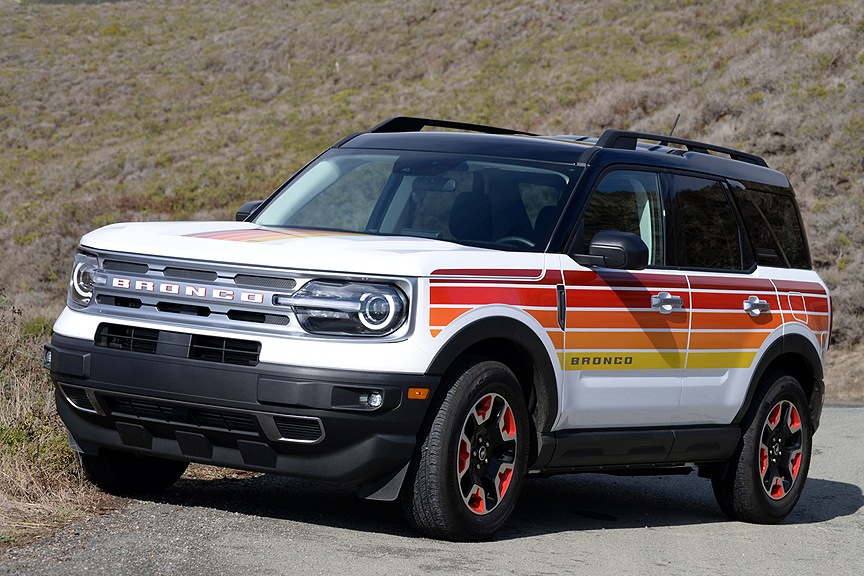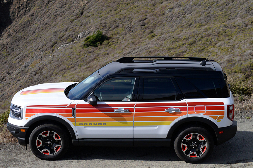 We were most impressed with Ford’s attention to detailing. For example, the grill and all four exterior door pulls are painted a metallic shade of silver that looks perfectly compatible with the precise vinyl stripe overlays. As for the stripes themselves, they are perfectly aligned and look like they will outlive the life of the Bronco. There's nothing cheap about this treatment.