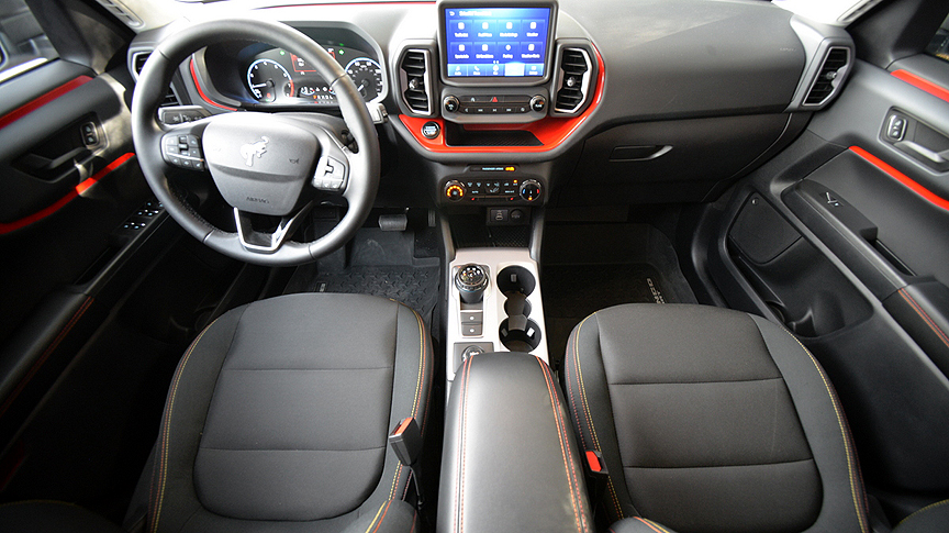 For that amount you receive a vehicle that is adequately off-road compatible thanks to full-time 4-wheel drive. The Sport is under-powered by a three-cylinder 1.5-liter gasoline-fueled engine mated to an 8-speed automatic transmission. This engine makes 181hp and 190lb.-ft of torque which won't make for fast acceleration, but will allow it to tow a 2,200-pound trailer. Our test Bronco was fitted with a $690 small receiver hitch and a wiring harness. This engine is quite a fuel miser, posting an overall EPA fuel economy rating of 26MPG. It will noisily accelerate the 3,593-pound SUV to 60mph in 8.2 seconds, and run the standing start quarter-mile in 16.3 seconds at 84mph. If that’s not quick enough, you can upgrade to the Badlands Bronco Sport, which Ford equips with a more powerful 2.0-liter inline-4 making 250hp and 277 lb.-ft. of torque. That version, also fitted with paddle shifters, will dispense with the zero-to-sixty MPH run in just 5.0 seconds, and cover the quarter mile in 14.5 seconds at 93mph.