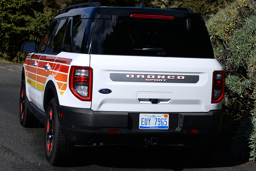 The particular version we drove garnered more stares per mile than anything else we tested this year. That’s because Ford selected a “Free Wheeling” example of the Bronco Sport for the press fleet. The multi-hued model we tested is one of five different Sport models available. The cheapest is the Big Bend ($29,795), followed by the Heritage ($32,365), the Free Wheeling ($33,730), the Outer Banks ($33,935), and the Badlands ($38,390). Our Oxford White test model was dolled up with a multi-hued five-color rainbow striping package that made it impossible to lose in any parking lot. Complete with “17-inch Ebony Race Red Painted Wheels,” our loaner also sported a $1,785 Convenience Package that included a wireless charging pad, LED fog lamps, universal garage door opener, 8-way power driver’s seat, rear parking sensors, and heated front seats. The addition of Ford Co-Pilot Assist ($895) brought the total tariff to $38,695. But Ford threw in a couple of “National Discounts” that dropped the sticker to $37,695.