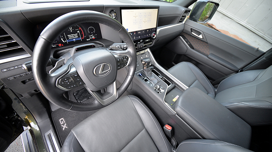 Since you won't be buying this brute of an SUV for its off-road prowess alone, let me note that it makes a surprisingly amenable companion for everyday driving. Sitting tall in the supportive GX saddle confers better sightlines in traffic than lesser SUVs can provide. Although you can't see the front or rear corners of the GX from the driver's seat, Intuitive Parking Assist with Auto Braking and Rear Pedestrian Detection pinch hits well for those missing sightlines. The interior of the Premium + level GX is luxurious and comforting in an understated way. There's nothing showy about this interior - no fancy stitching or suede inserts - but most everything you need is right there, either in button form, or touchscreen form. One irritant we noted was that switching from one touch screen to another automatically loses (or gains) the icons controlling the seat and steering wheel heaters. Having icons appear and disappear with unpredictable random frequency is not only disconcerting but also dangerous to your driving concentration.