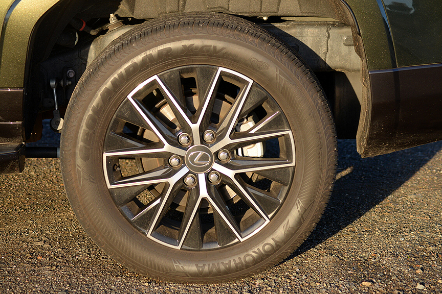 When it comes to back road rambles, there's virtually no terrain the GX can't conquer in 4WD Low Range with Crawl Control activated. A locking Torsen limited-slip center differential seals the deal on precise traction management. GX 550-specific 20-in. x 7.5-in. alloy rims are shod with 265/55R20 Yokohama Geolander X-CV extra load radial rubber (TW 360). The wheels look fetching with their six black and bright machined finish spokes. To keep an eye on how your Lexus is coping with the trail surface, Lexus has equipped the GX with a Panoramic View Monitor System (PVM) that projects images from 4 multi-terrain cameras onto a 14-inch wide dashboard display monitor. Using this information, an intrepid off-roader can check on obstacle clearance and road conditions from the driver's seat and make intelligent decisions before trouble strikes.