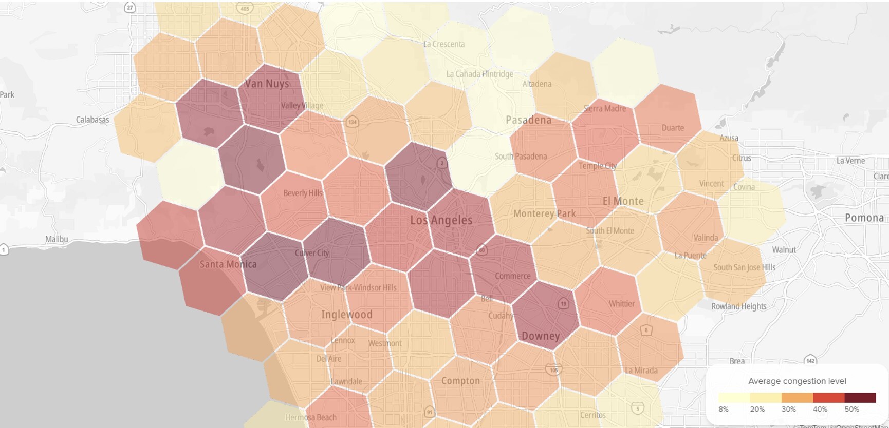 In the Santa Monica area, the average annual congestion level was above 52%.
