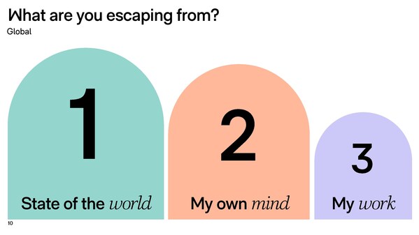 - Escape Decoded: The research reveals significant differences in how people view escapism around the world. For example, while people in the U.S. often seek to escape the "State of the World," those in France are more likely to disconnect from "the news." In China, the focus shifts to escaping "parents and older relatives," whereas in India, it's about stepping away from "social media."