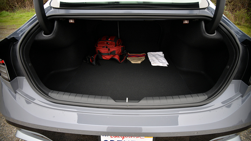 The second reason you will want to give this Sonata a close look is the tailored excellence of its interior. The Limited is the top model in the Sonata line, and as such comes with a full complement of really cushy luxury touches. Literally topping the list is a huge panoramic sunroof which admits so much ambient light when open that you and your backseat companions will feel like you're enjoying a convertible. The exceptionally comfortable and supportive front seats are heated (along with the steering wheel) and ventilated. They're also finished with high-quality leather. The dark gray hide sported a salt and pepper look that brightened the spacious interior and integrated artfully with the striated ivory and charcoal dashboard. The 60/40 split folding rear seats are fully sized for grownups and offer an abundance of legroom.