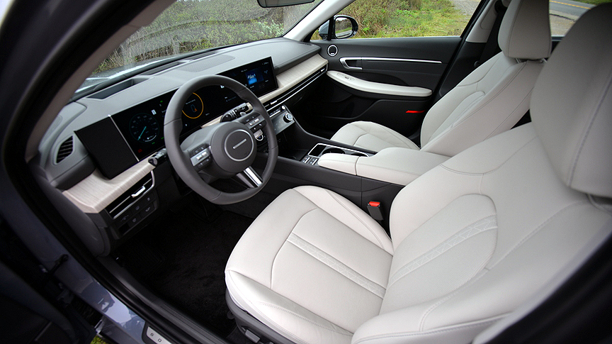 The third outstanding benefit you will derive from your selection of a Sonata Limited is financial. Our test hybrid carried a base price of just $37,450, which is close to ten grand below the average retail price of a new vehicle in the USA today. When you consider the list of extravagant standard features that the range-topping Limited affords above and beyond lesser Sonatas, you will likely consider its choice a done deal. Both front seats are 4-way power-adjustable, and my wife and I agreed that the support provided was exceptional. The driver can lock mirror/seat configurations into the two position integrated memory system. The Limited offers a standard 12 speaker Bose Premium Audio system with a 90-day free trial subscription to SiriusXM Radio. Every album cover that XM deejays play is vividly depicted on the cockpit's 12.3-inch touchscreen. The brilliant monitor also displays AM/FM/HD radio as well maps for the onboard Navigation System. Finally, the Limited also features remote smart parking assist that allows the Sonata to be operated via the key fob for short distances.