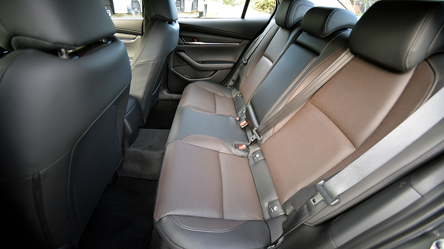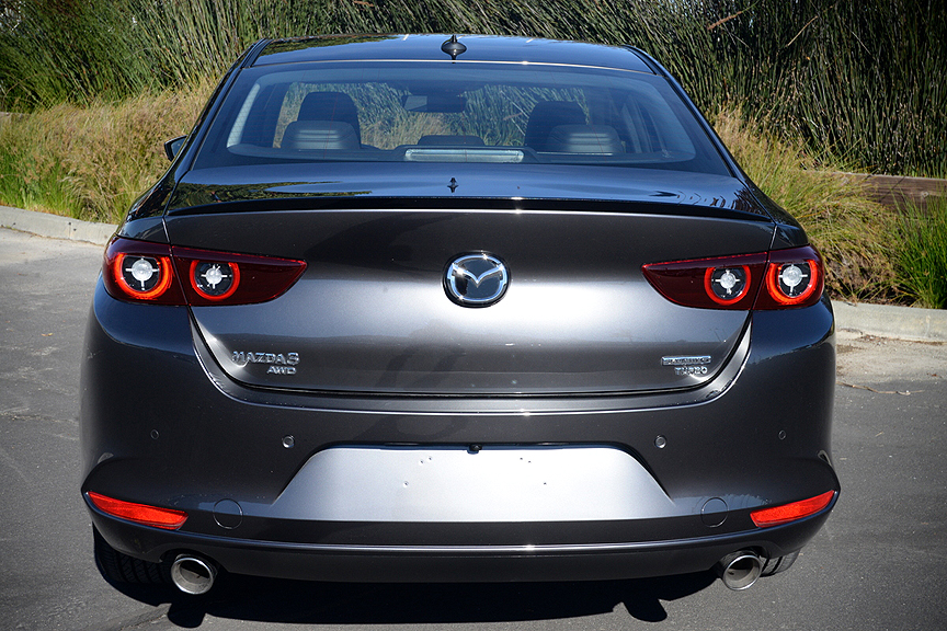 Cosmetically, the only appearance item differentiating the '25 from the '24 Mazda3 is the latest version's gloss black rear spoiler. In Premium Plus trim, the interior benefits from full leather seats (available in black or red), a distinguished 12-speaker Bose audio system, and a 10.25-inch color center display screen that can operate in touchscreen mode when directed by Apple Car Play or Android Auto. The typical Mazda selector wheel also suffices for commanding operations. The front seats proved supportive and well configured, while the rear seats felt rather confining due to the low height (56.9 in) of the sedan's roof. Another drawback to the 3's streamlined architecture is the frequency with which you whack your noggin on the roof when alighting from the car. I did it twice, once on the driver's side, and once on the passenger side.