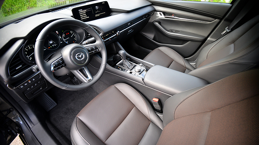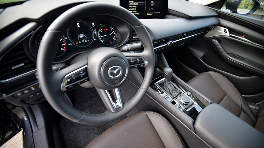 The all-wheel-drive Mazda3's performance envelope is enhanced by a do-it-your way 6-speed automatic gearbox. This shifter can be locked into manual mode by slotting the stick on the console into its manual-only gate, then bumping the stick forward for downshifts and backward for upshifts. You can also operate the transmission with small paddles attached to the steering wheel. If you've locked the console stick into the manual gate, those paddles will retain your chosen gear until you decide to make an upshift or downshift. Also note that if you are set on shifting your own gears manually with a clutch and stick, you can do so by selecting the $30,560 front-wheel-drive Mazda3 2.5S hatchback, which can be ordered with a 6-speed manual. This kind of belt-and-suspenders approach is typical of Mazda, a company dedicated to making enthusiasts happy.