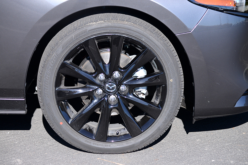 Partially responsible for the high cornering force generated by the Premium Plus Sedan are its excellent Bridgestone Turanza EL440 (215/45R18) radials. Although mud and snow-rated, these touring tires hung on like leeches when we snapped the 3 from apex to apex without a squeal of protest. Mazda's G-Vectoring Control Plus suspension tuning and Dynamic Stability Control combined to extract maximum lateral grip from the relatively hard compound (TW 480)Turanza rubber. This model range-topping Mazda 3 proved itself a great back road dance partner. When you lead it follows without hesitation. We were also impressed with the smooth, progressive and predictable braking capabilities of a car that had less than a thousand miles on the clock when delivered to us.