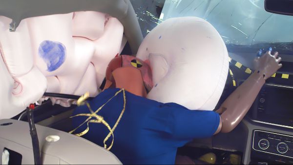 For vehicles in which dummies had high DAMAGE scores, there are feasible solutions to reduce injury risk. For example, one idea to reduce head rotations is a deeper frontal airbag that is softer in the center, where a person’s head would hit. This would create a “catcher’s mitt” effect that cradles the head instead of causing it to deflect off the surface of the airbag and whip to the side.
