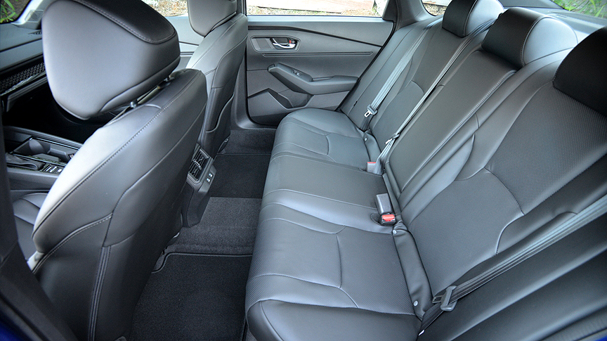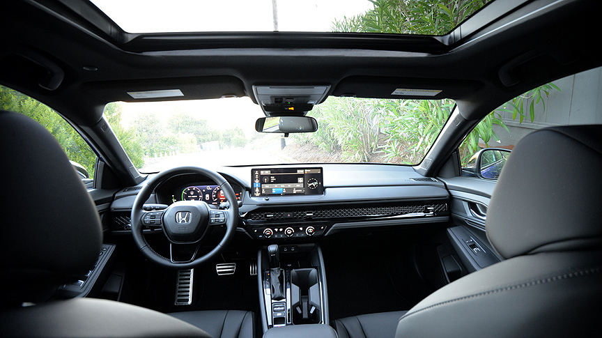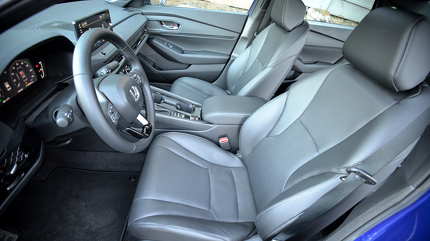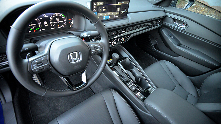 The interior of the Sport L package leaves very little to be desired in terms of amenities or convenience. The leather-trimmed front sport seats proved supportive and handsome, with 10-way power adjustment on tap for the driver, and 4-way power available to the passenger. Given the high cornering penchant of the Goodyear tires, however, a bit more side bolstering would be appreciated. One of the prime benefits of selecting the latest Accord is the superb visibility it provides in every direction. In particular, the expansive view rearwards, enhanced by an exceptionally large pane of glass, was much appreciated. However, a rear wiper is needed since the flat pane, even though heated, takes forever to clear in stormy weather. Note that although both front seats are heated with 3-stage warmers, the steering wheel rim is not included in the Sport L's Hybrid's heat program. For that added warmth you'll need to upgrade to the top-tier Touring Hybrid which unaccountably carries a base price $3,925 more expensive than the Sport L we tested.