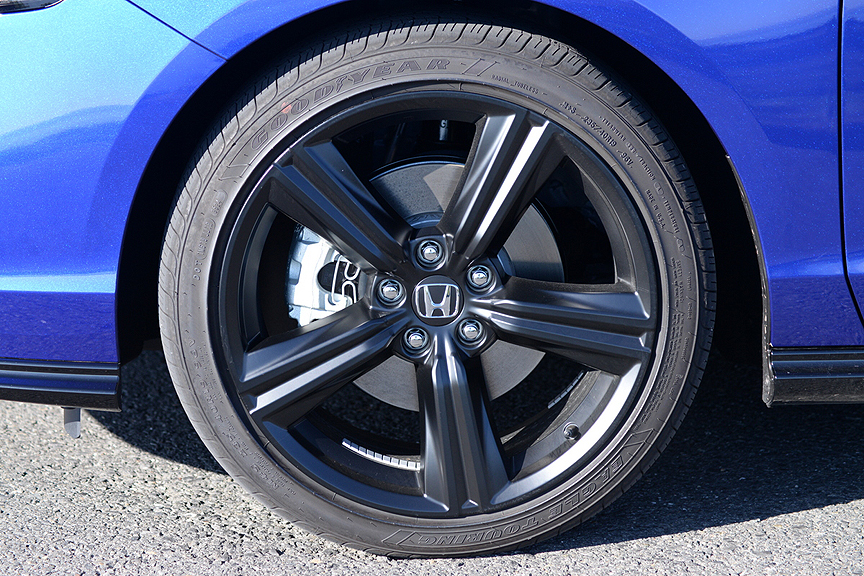 The understated good looks of the 2025 Accord are enhanced by a stunning optional ($455) coat of Canyon River Blue Metallic paint. The sleekly styled body shell is counterpointed by gloss black alloy rims, front splitter, exterior trim, rear spoiler, and rear diffuser. But the real magic happens where you can't see it, with a front MacPherson strut/rear Multi-Link suspension system tuned to transmit road surface information to the driver with uncanny accuracy.