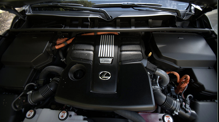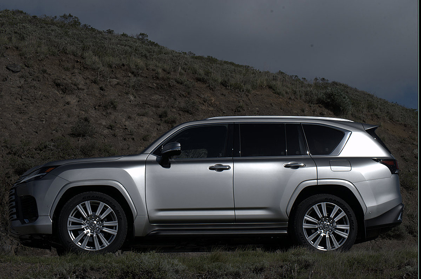 Of course, there are a few more pertinent facts you might care to know about this three ton hybrid. The first pertains to its drivetrain, which features a 409hp, 479lb.-ft. twin turbocharged, 3.4 liter V6 coupled to a 48hp, 184lb.-ft. AC motor. These two powerplants drive all four wheels through a 10-speed automatic transmission equipped with alloy paddle shifts. The hybrid system generates a combined 457hp and 583lb.-ft. of torque. The enormous torque output is responsible for the LX 700h's 8,000lb trailer tow rating. We found an anvil-weight receiver hitch in the rear storage area waiting to be unwrapped and locked into place with a chrome pin as big as your middle finger.