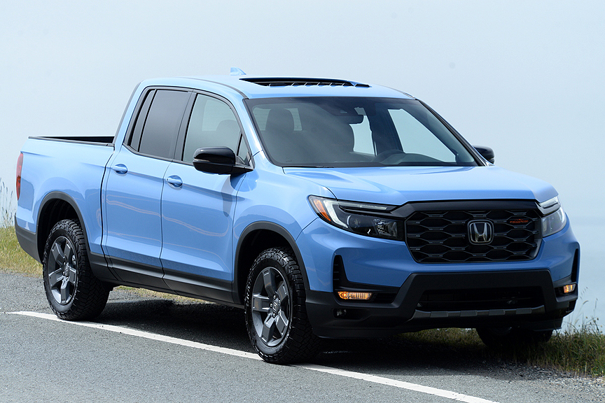 The Honda Ridgeline is the truck for people who need a pickup but don't want to drive one. But this seemingly insoluble conundrum has been neatly resolved by Honda's engineering staff. Their compact Ridgeline truck combines car convenience with truck toughness. Ridgeline utilizes the closed box frame and unit body construction that underpin Honda's Pilot SUV and Odyssey minivan. However, instead of the triple row seat seating for 8 offered by those passenger Hondas, Ridgeline substitutes a 4-door, 5-person cab attached to a 5'3" pickup bed. The tail of that bed features a lockable dual-action gate designed to drop flat or pivot sideways. The ingenious steel-reinforced composite cargo bed contains a weatherproof 7.3 cubic foot storage locker, located out-of-sight beneath the bed floor. With its 50 inch wide spread between the rear wheel wells, the Ridgeline's bed will tote a 4'x 8' plywood sheet lying flat on the floor, a pickup feat unique to just this Honda.