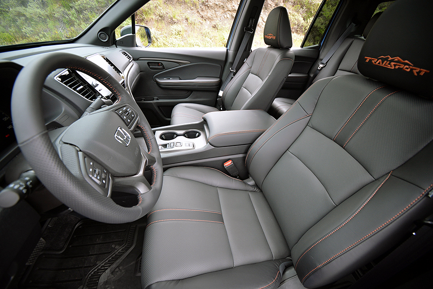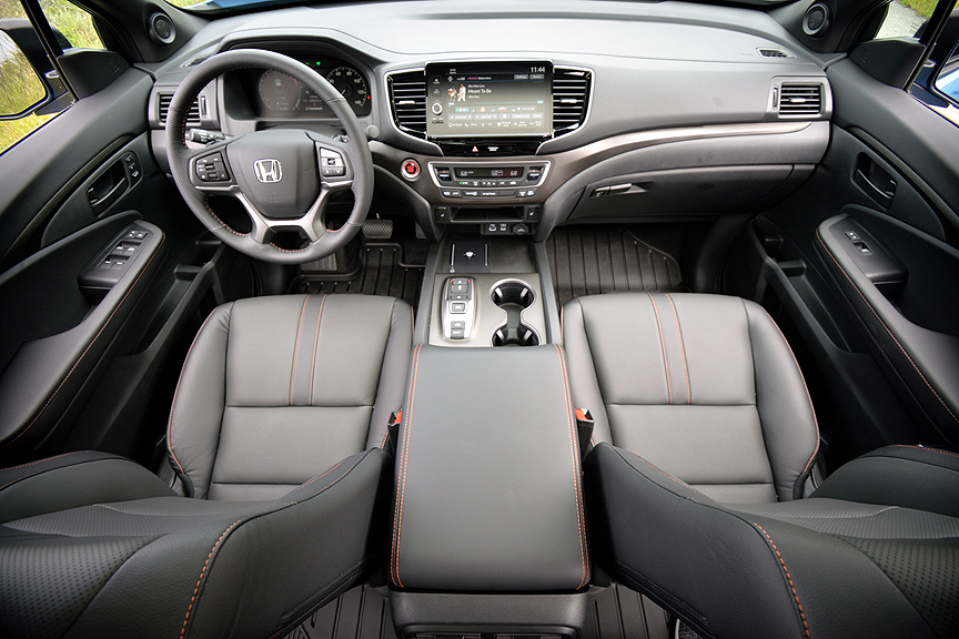 In addition to the suspension upgrades, the Trailsport package distinguishes itself from lesser Ridgelines in several notable ways. The most obvious is color. Our test Honda was finished in an optional ($455) color called Diffused Sky Blue Pearl, which is only available on the Trailsport model. Honda scatters a number of orange model badges on the flanks, grill, and tailgate of the Trailsport. These insignias match the special orange interior stitching, Trailsport logo seats, and model-specific rubberized floor mats that spiff up this truck's interior. Honda also adds an oil pan protector for off-road forays, and bathes the interior with orange lighting at night. If that isn't enough customization for you, then check out the vast number of accessories available to carry a bicycle on the roof, or a bed extender to accommodate motorcycle portage.