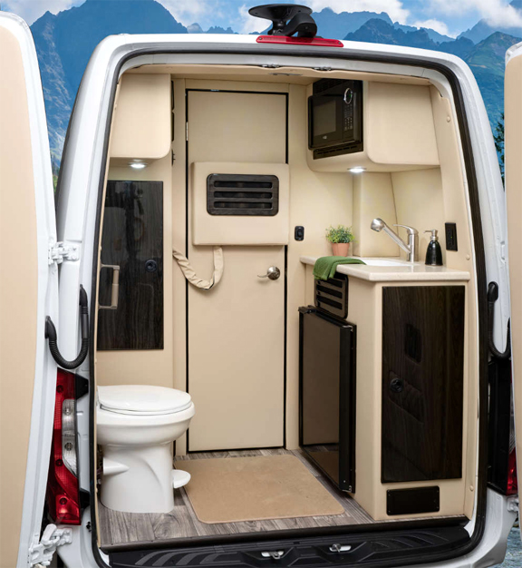 The rear bath setup, complete with a porcelain toilet, sink, microwave, and refrigerator, makes this van not just a means of transportation — but a true mobile suite. For those looking to travel off the grid, the optional Freedom 600 Package adds lithium batteries, solar panels, and a diesel furnace, enhancing the Cruiser’s versatility even further.