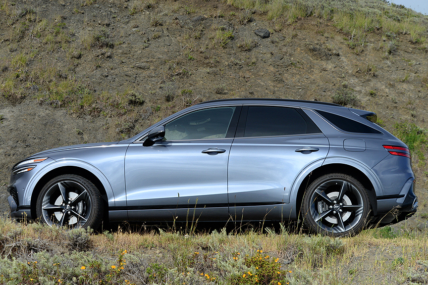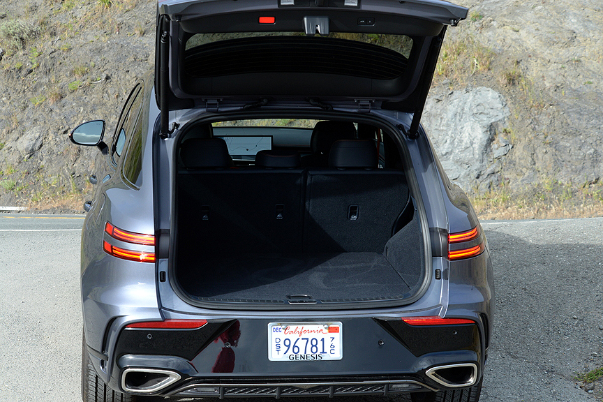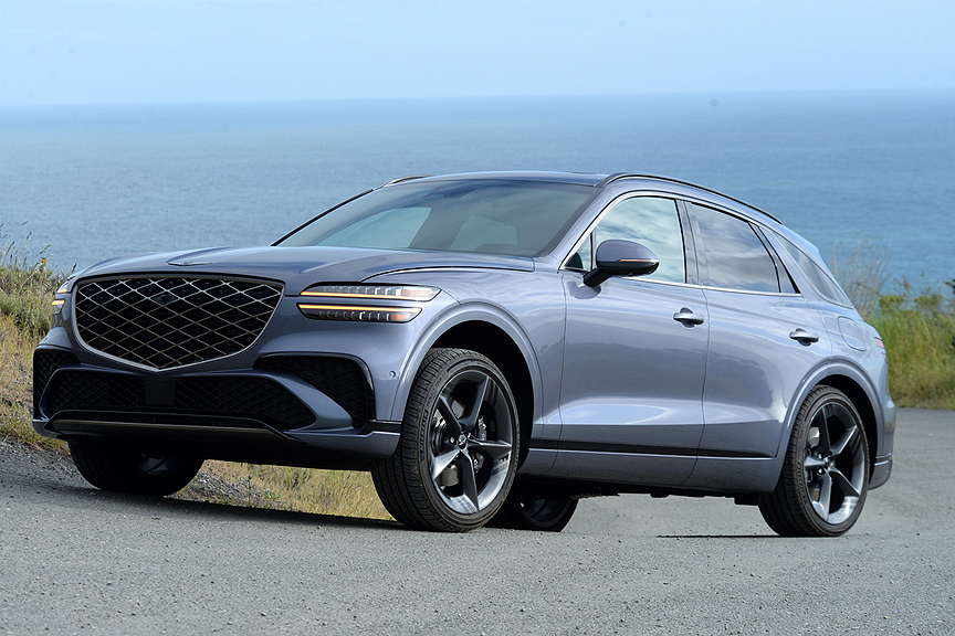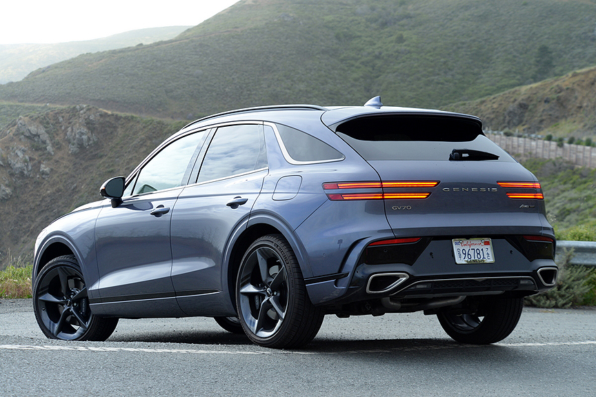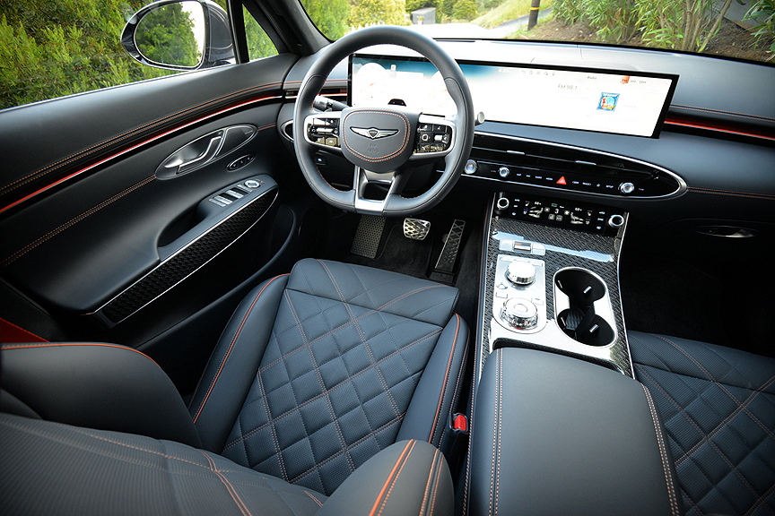 Let' start with the monster motor Genesis plants under the GV's sleek hood. This delicious engineering confection displaces just 3.5 liters (212 cubic inches), but manages to extract a whopping 375 hp and 391 lb.-ft of torque. The apparent discrepancy between modest displacement and unexpectedly fulsome output is due to the inclusion of twin intercooled turbochargers, double overhead camshafts actuating 24 valves, and both port and direct fuel injection. This exotic medley produces a barely muffled shriek when the loud pedal is pressed. Driving through a paddle-shiftable 8-speed automatic gearbox, the all-wheel-drive GV70 hooks up instantly when you prod the throttle. Although this sport utility weighs in at 4,584 pounds, it will scat through the standing start quarter mile in 13.5 seconds at 103mph, and post a 4.9 second 0-60mph time. Zero to 100 mph requires just 12.6 seconds, and in 25 seconds, the GV70 will reach 130mph. In other words this thing is a flat out rocket, and it still manages to return 25MPG on the highway, and 21MPG Overall.