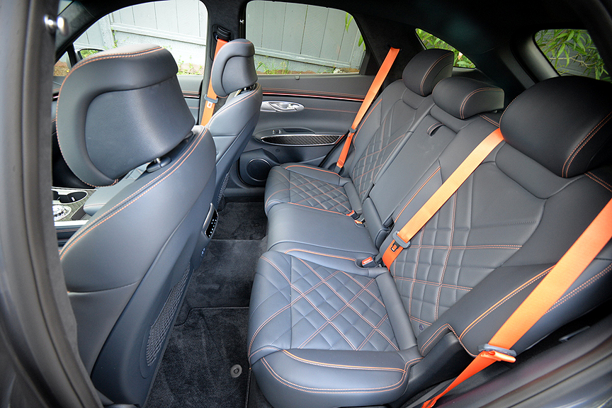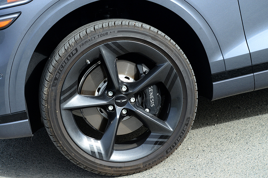 Handling of this SUV is commendable. In fact, with its relatively low profile roof line (64.2 inch height) contributing to a reduced center of gravity, the twin turbo proved to be something of a turn monster, devouring twisty backroads with aplomb. Genesis equips the Sport Prestige with an idiosyncratic set of 5-spoke "Sport Alloys" finished in gun metal gray, and adorned with subtle black twin hash marks at the base of each spoke. These 21-inch rims, which are unavailable on the aftermarket, mount Michelin Primacy Tour A/T rubber (255/40R21) with long-life expectancy thanks to a TW 540 rating. The AWD configuration churns all four Michelins through the turns, and I would put this Genesis up against any $100,000+ Porsche Macan or 5 Series BMW in a direct handling comparison. Again, while this Genesis may seem initially expensive, it proved to be rather a bargain considering the company it keeps (and beats).