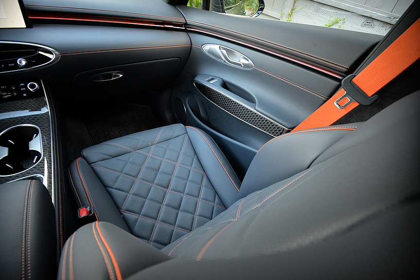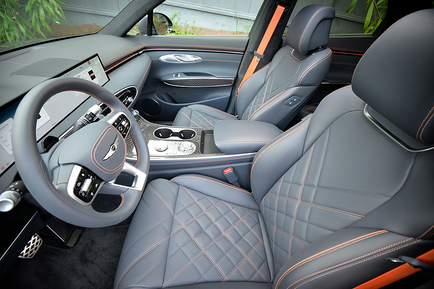 But you certainly don't have to be a speed demon to appreciate the limitless benefits that Sport Prestige ownership bestows on its lucky owner. From the instant you swing open the driver's door, you're stunned by this GV70's show car interior. Vibrant orange stitching gives the glove soft Nappa leather seats an ethereal look. Generous swatches of carbon fiber adorn the center console and the facings of all four door armrests. Matching seams of orange stitching on the dash and doors coalesce to produce an artisan masterpiece. The vibrantly orchestrated combination of ultramarine leather is given a finishing touch by orange safety belts at every corner. The fat rimmed steering wheel is a pleasure to twirl, the aluminum throttle and brake pedals feature rubberized inserts, and the cabin's roof is covered with a plush microfiber suede headliner.