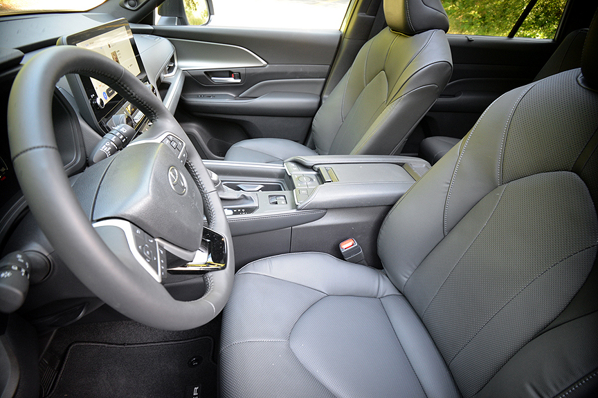 The logical dash layout we have come to expect from Toyota is evident in spades the instant you climb aboard the Grand Highlander. The front and second row seats all offer excellent lower back and side support. The shift mechanism is perfectly located where your right arm comes to rest atop the transmission tunnel. The "Start" button is located d irectly in your line of sight, not hidden behind the steering wheel rim. Best of all, Toyota engineers have resisted the temptation to cram all necessary driving functions into one of those digital menus so popular today with designers looking to "clean up the clutter." Instead of going down that distracting path, Toyota has graced Grand Highlander operators with 26 wonderfully physical buttons splayed across the dash, plus another dozen on the spokes of the steering wheel. We reveled in the fact that you can actually activate everything from the HVAC temp to the seat heaters to the suspension settings without taking your eyes off the road to play video pong.