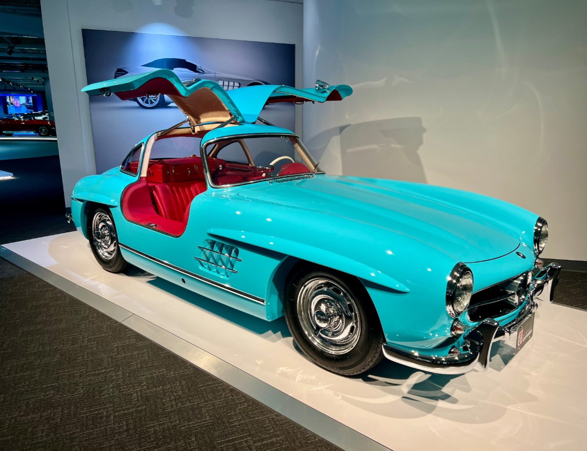 To celebrate our eighth anniversary, we’ve unveiled a truly special addition to the Newport Car Museum’s world-class collection: a 1955 Mercedes-Benz 300 SL Gullwing, restored by Legendary Motorcar Company (LMC) and custom finished in a dazzling made-to-order cyan blue with a bold red leather interior. This striking color combination turns an already legendary car into an unforgettable visual and historical centerpiece. Known for its iconic upward-opening doors, groundbreaking fuel-injected straight-six engine, and lightweight tubular frame, the 300 SL Gullwing is often hailed as one of the most beautiful and innovative cars ever built, and this particular example is unlike any other on the planet.
