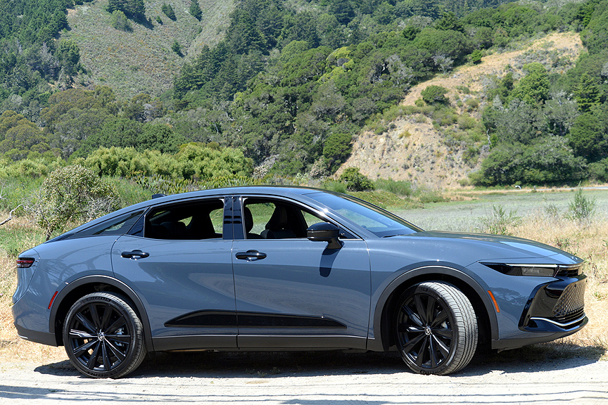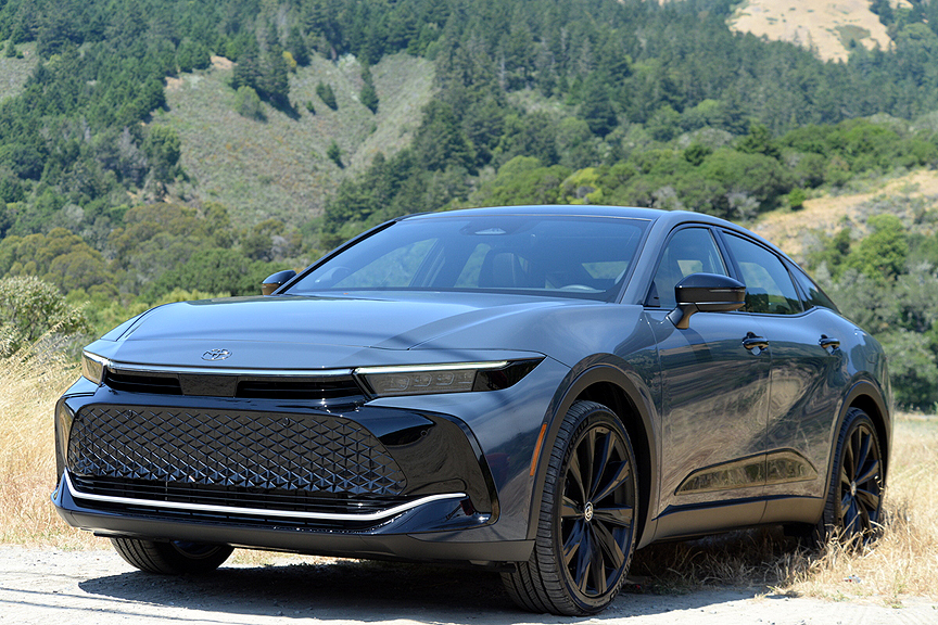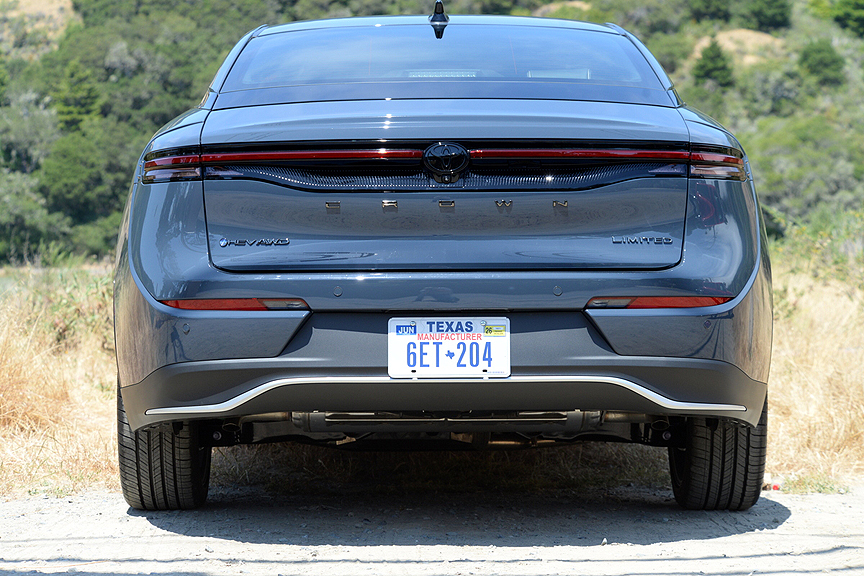 Thanks to the veil of shade, night has fallen on the Crown. Purists will delight in the visual transformation wrought by newly blacked-out trim. Since its introduction in 2024, the Crown has occupied a dysphoric slot in the Toyota lineup, somewhere between a sedan and a utility vehicle. Stylistic indecision has partly led to that optical confusion, with the Crown's lofty 5.8 inch ground clearance and 60.6 inch height seeming to indicate off-road capabilities, a notion supported by the availability of all wheel drive. However, the sedan's sloping roofline prevents use of an SUV-like liftgate door. Consequently, all goods and belongings are relegated to just 15 cubic feet of trunk storage. Flattening the rear bench seatbacks allows you to tote a limited number of longer items that protrude into the cabin.