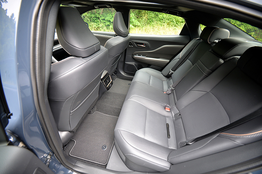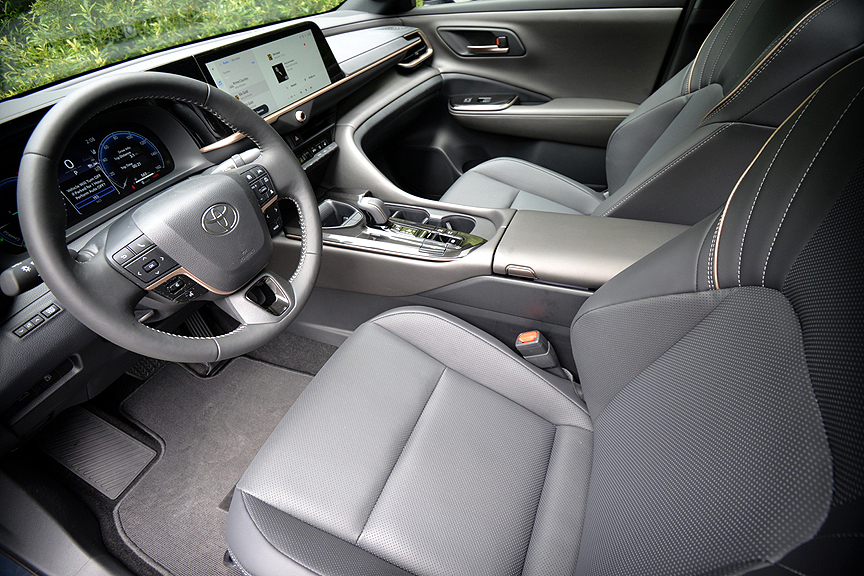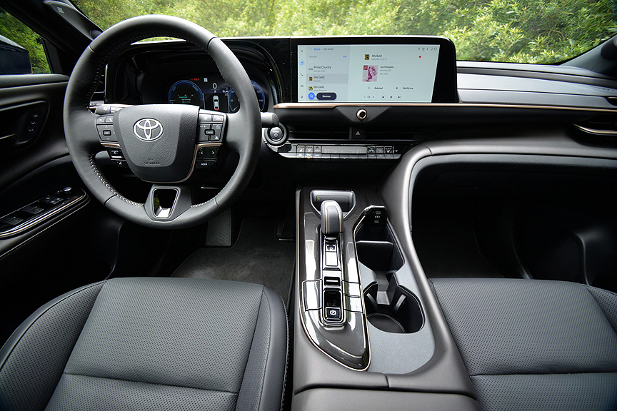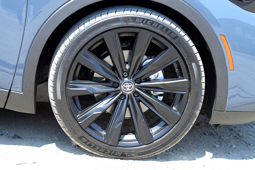 Lately, the cornerstone motto at Toyota is 'When in doubt, black it out." Diligently following that prescription, the Crown's Nightshade treatment includes 21 x 8J matte Black alloy rims fitted with 225/45R21 Michelin Primacy Tour A/S radials (TW540). These large diameter rims coupled with short 45 series tires visually drop the height of the Nightshade to near low rider specifications. In addition, all the busy trim bits have been dipped in dark: external badging, side door handles, front grill, and front door touch sensor plates. While the Crown is available in six different colors (including Black, of course), it's a perfect candidate for the new Crown shade called Storm Cloud. This distinctive gray graced our test vehicle and blended beautifully with the darkened trim.