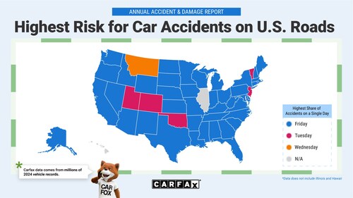 CENTREVILLE, Va., July 23, 2025 -- Fridays are the riskiest day for car accidents for most U.S. drivers, according to new data from CARFAX. More accidents occur on Fridays than on any other day of the week in at least 43 states, with the end of the work week rush likely a contributing factor. By contrast, Sundays were the quietest on U.S. roads, with the fewest incidents reported in almost all states.